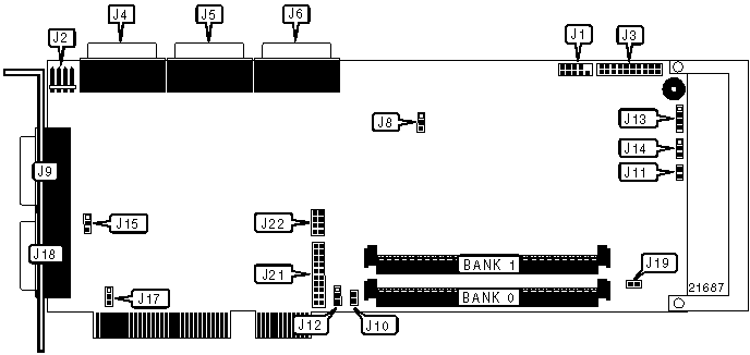 68-pin SCSI channel 1 connector - external | J9 | Cache battery backup connector | J21 |