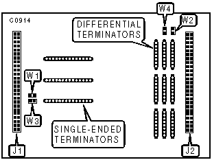 Note: When W1 is closed, TERMPWR is supplied to a remote terminator on the single-ended side. When W2 is closed, TERMPWR is supplied to a remote terminator on the differential side. | |||||