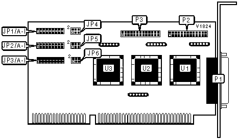 Model SUN-6334-2 (Ex-4012) only supports two parallel ports, P1 and P2. Consequently, only two socketed chips (U1 and U2) are installed. Jumpers JP3 and JP6 ignored. Model SUN-6334/3 (Ex-4016) supports all three parallel ports. All three socketed chips are installed and all jumpers must be configured. |