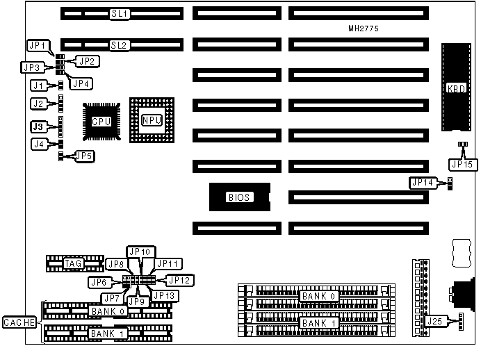 Power LED & keylock | J3 | 32-bit VESA local bus slots | SL1 & SL2 |