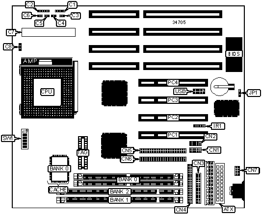 SMM connector | C7 | 32-bit PCI slots | PC1 – PC4 |