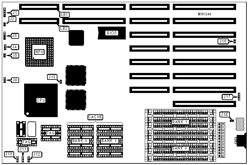 Reset switch | J2 | 32-bit local bus slots | LB1 & LB2 |