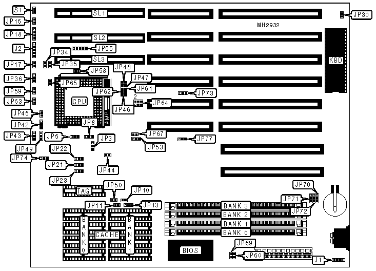 Turbo switch | JP17 | 32-bit VESA local bus slots | SL1 - SL3 |