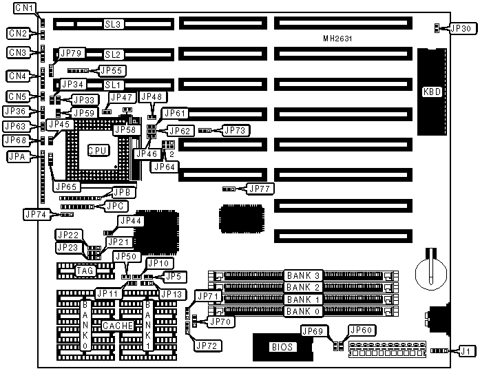 Power LED & keylock | CN4 | 32-bit VESA local bus slots | SL1 - SL3 |