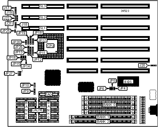 External battery | J20 | 32-bit VESA local bus slots | SL1 – SL3 |