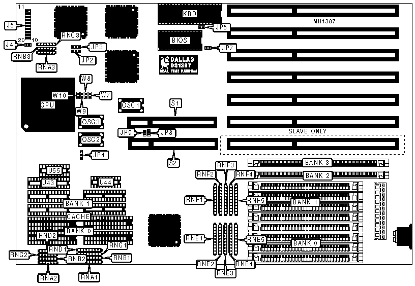 Turbo switch | J5 pins 7 and 17 | 32-bit VESA card (2) | S1 & S2 |