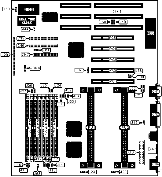 Note: The location of the following jumpers are unidentified: J1-J5, J9, J35, J38, J39, J42, J43, J45-J48, J51-J55, J57, J59. | |||