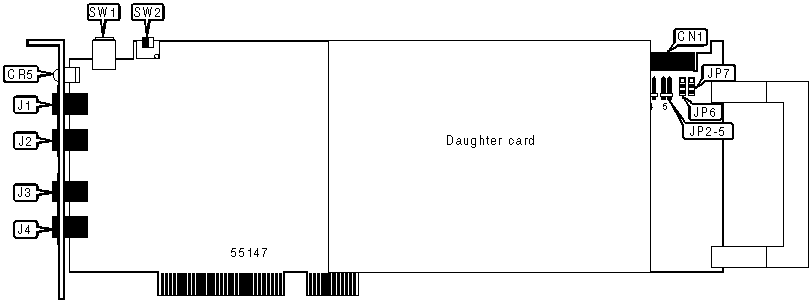 Channel 1 via RJ-11 | J1 | 52-pin fax daughter card connector | J5 | |||