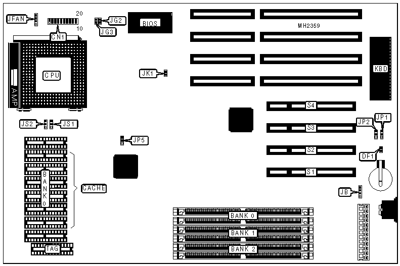 Turbo switch | CN1 (pins 15 - 17) | 32-bit PCI slots | S1 - S4 |