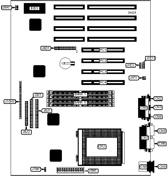Power connector | J5M1 | 32-bit PCI slots | PC1 - PC4 |